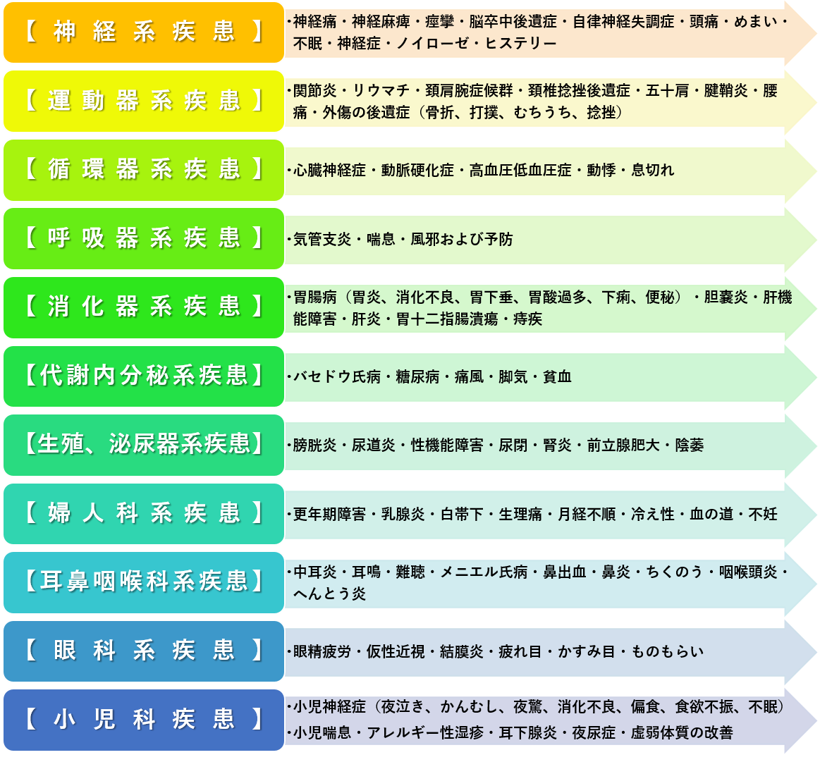 WHO(世界保健機構)の定める鍼灸の適応症は以下の通りで腰痛や頸肩部痛だけではなく、様々な疾患・症状に効果が期待できます。
